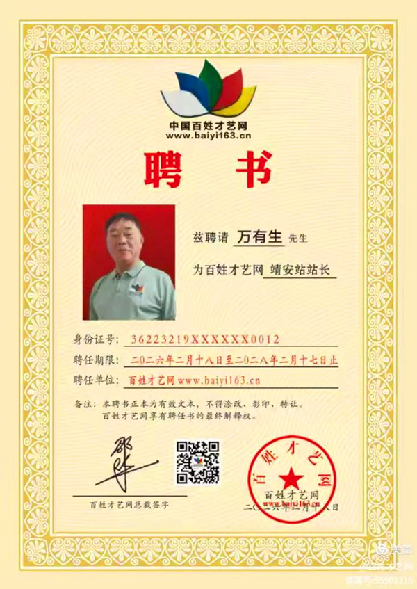 百姓才艺网快讯(百艺/文)百姓才艺,彰显魅力。为进一步推动江西靖安地区群众文化艺术事业发展,壮大基层文艺传播力量,经百姓才艺网编委会研究决定:聘任万有生同志为百姓才艺网江西靖安站站长,全面负责靖安地区文化艺术交流、活动组织、运营服务与宣传推广等工作。