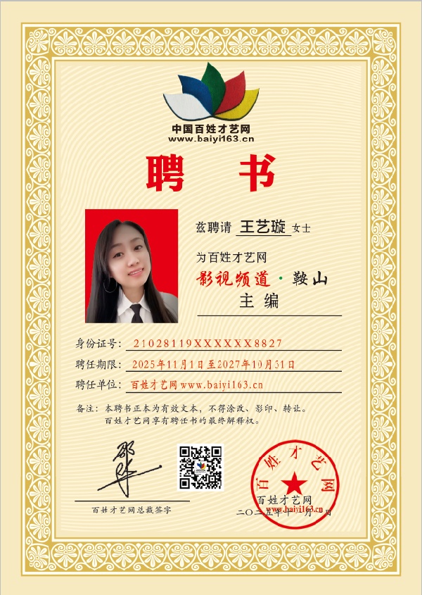经百姓才艺网编辑委员会研究决定,聘任王艺璇同志为百姓才艺网《影视频道.鞍山》主编,负责鞍山地区文化艺术影视传媒业务交流开展、运营服务工作。