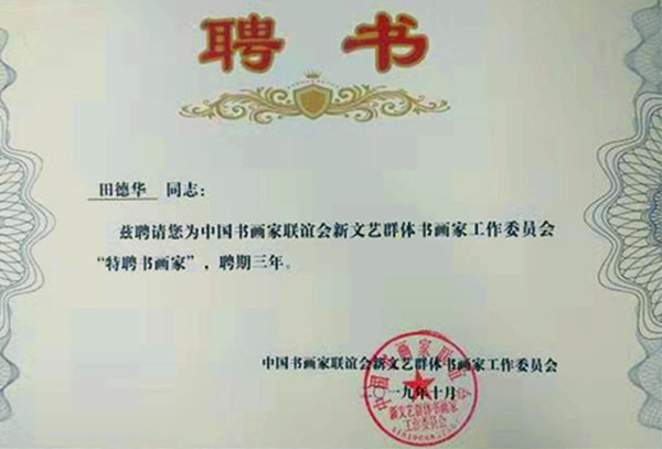 2013年书法作品被《盛世收藏红色宝典——当代中国书画名家鉴赏》收录。2014年与艺术大家合出《留香——聚焦中国当代书画名家十人集》、《弘扬经典,推崇名家》中华国礼艺术名家精品挂历。作品入选法国、美国,中国邮政、电信各部门集邮中心出版发行的6套纪念珍藏邮册,其中2015年“庆祝中美建交36周年”出版发行《中美杰出华人田德华邮票纪念珍藏册》并荣获“中美杰出华人艺术家”荣誉证书。在2017年参加“不忘初心继续前行——喜迎党的十九大”活动,荣获“喜迎十九大——中国当代书画艺术名家”荣誉证书,其书法作品被《中国邮册》收录。