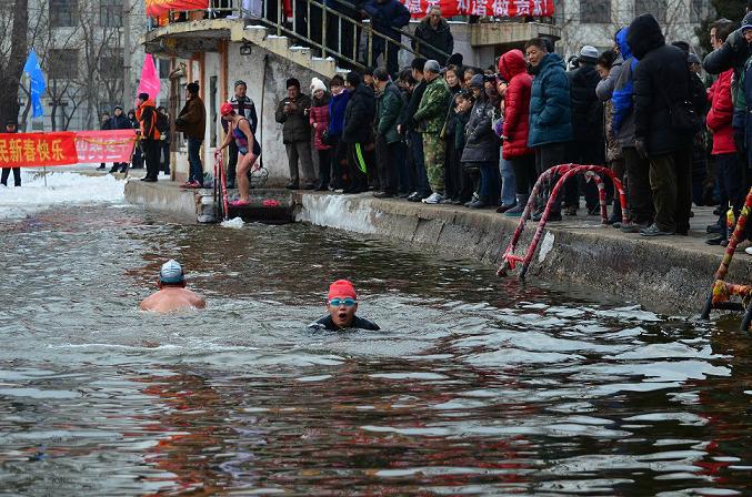 2014年元旦,也是第19个“全国冬泳日”,辽宁鞍山冬泳协会在“二·一九”公园游泳湖举办庆祝活动。